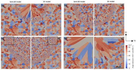 Figure 12. SD sections of CA microstructures obtained by semi-2D simulation with a cell size of 250 nm (a,c,e,g) and 3D simulation with a cell size of 1 µm (b,d,f,h) at (a,b) scanning speed of 1000 mm/s and platform temperature of 298 K, (c,d) scanning speed of 500 mm/s and platform temperature of 298 K, and (e,f) scanning speed of 500 mm/s and platform temperature of 473 K. Microstructures (g,h) obtained under the same scanning conditions of (e,f) without the particle-based nucleation. Figure 13 shows a higher magnification of the areas marked by frames in (e,f).