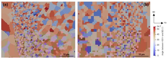 The presented results in Figure 8, Figure 9 and Figure 10 are supported by the experimental findings in the literature addressing more equiaxed grains at higher energy density and platform temperature [13,15]. Figure 11 presents the electron backscatter diffraction (EBSD) micrographs obtained by Yang et al. [13] under two different scanning speeds and platform temperatures. The same type of Sc- and Zr-modified Al alloy with a composition fairly similar to Scalmalloy were used in this study (Al-3.8Mg-1.08Sc-0.23Zr (wt %)). The results qualitatively confirm the current findings. That is, the fraction of equiaxed grains is increased by decreasing the scanning speed and increasing the platform temperature. The microstructure is almost fully covered by equiaxed grains driven by particle-based nucleation at low scanning speed and high platform temperature (Figure 11c).
