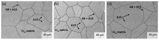 Figure 1 shows the microstructures of all investigated compositions after annealing for 100 h at 1200 °C. The microstructure consists of a Crss matrix with precipitates of an A15 Cr3Si intermetallic phase, which is in agreement with previous studies [7,8,9]. Since the specimens were not subjected to a solution heat treatment but only an annealing step, the microstructures of all alloys show coarser precipitates along the grain boundaries (GB) and finer precipitates inside the grains.
