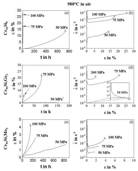 Creep curves ε vs. t and vs. ε at 980 °C in air of the alloys Cr91Si9 (a,b), Cr91Si7Ge2 (c,d) and Cr91Si7Mo2 (e,f). Fractured samples are highlighted with an X at the end of the curve. In case there is no symbol, the test was aborted.