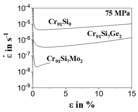 Figure 3 shows the strain rate vs. strain curve of the 75 MPa samples. It shows even clearer the improvement in creep strength by adding Ge and Mo. The duration of the experiments is an additional factor that influences the creep properties of the Mo containing alloy and the Cr91Si9 and Cr91Si7Ge2 alloys tested at 75 MPa and 100 MPa. For a deeper investigation, additional experiments were carried out with the ternary Cr-Si-Ge alloy.