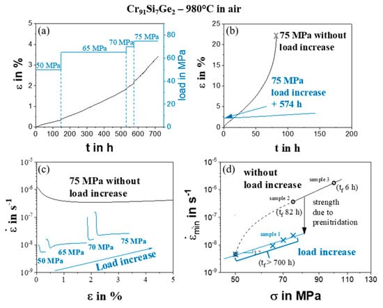 Figure 4 shows the influence of prolonged exposure in air on the creep properties of the Cr91Si7Ge2 alloy. A load increase from 50 to 65, to 70 and finally to 75 MPa was carried out. After reaching the minimum creep rate, the load is increased (see creep curve in Figure 4a). In Figure 4b the difference in strain over time of a pretested sample (574 h at 980 °C in air and 2% initial strain) and the original 75 MPa sample is plotted. Whereas the original sample reached more than 20% strain, the pretested sample achieves only 1% additional strain. Figure 4c shows this behavior even clearer.