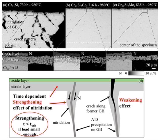 BSE-images of the cross sections of all alloys tested at 50 MPa with details of the formed surface layer and corresponding N element distribution maps. (a) Cr91Si9, (b) Cr91Si7Ge2 and (c) Cr91Si7Mo2. (d) Schematic drawing of nitridation of the specimen surface, along grain boundaries (GB) and crack edges that can be beneficial due to a volume increase. At higher loads, embrittlement by nitridation results in much lower strain to failure.