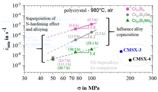 Norton-plot of the tested polycrystalline alloys in comparison with the single crystalline Ni base superalloys CMSX-3 and CMSX-4 [33]. Values in brackets represent the time to reach minimum creep rate (tmin creep). It should be noted that comparison is made between polycrystalline materials of this study and single crystalline Ni-base superalloys.