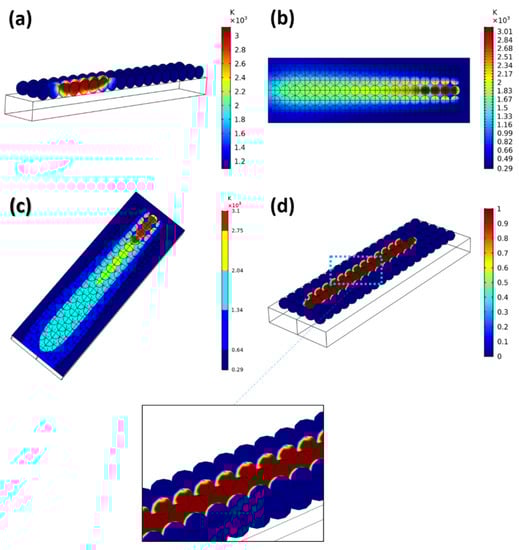 The multiphysics model described in Section 3 was used to simulate the metal powder–laser interaction. A three-dimensional model was designed, and a time-dependent study was used. Considering the powder size distribution in the datasheet of the Concept Laser (Concept Laser, Lichtenfels, Germany) and the practical layer thickness during the manufacturing, the average diameter of powders was considered 40 μm (layer thickness). Then powders were modeled as homogeneous 40 μm spheres, which were assumed to be homogeneously distributed on the built plate. Simulations were done in one path of 720 μm distance and the model was formulated symmetrically to reduce the calculation time in the simulations.