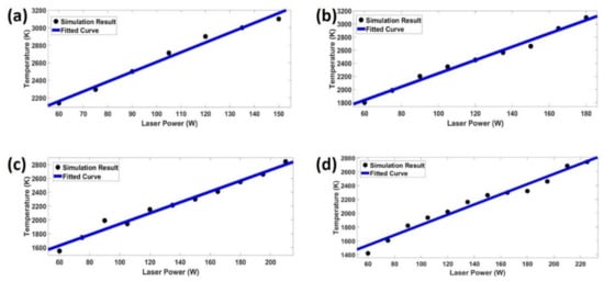 Simulation results and fitted curves of melt-pool temperature at various laser powers with a laser spot diameter of  and scanning velocity of (a) 0.6 , (b) 0.9 , (c) 1.2 , and (d) 1.4 .