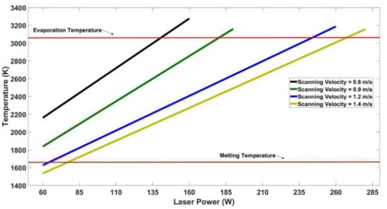 Figure 5 shows the fitted curves of laser power–temperature in various scanning speeds together. The red lines split the graph into three parts. The upper part of the evaporation temperature line denotes laser powers, which will cause evaporation mixing melting and the related defects in part, while the lower part of the melting temperature line will have unmelted or low-melted/sintered powders in the fabricated part. The laser power should be able to melt not only the powders of the new layer, but also it should be able to melt a part of the previous melted layers (lower and neighboring layers) again to bond the new and prior layers together. The proper laser powers for melting are the areas between evaporation and melting temperature lines.