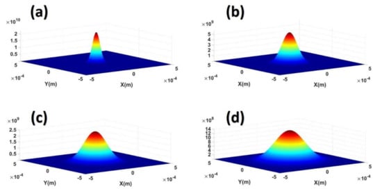 Gaussian distribution of the heat source for laser spot diameters of (a) 50 , (b) 100 , (c) 150 , and (d) 200 .