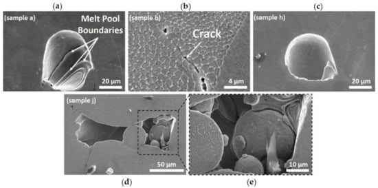 SEM images of defects: (a) void with melt-pool boundaries in the sample a, (b) a crack in the sample b, (c) entrapped gas pore in the sample h, (d,e) unmelted powders in the sample j.