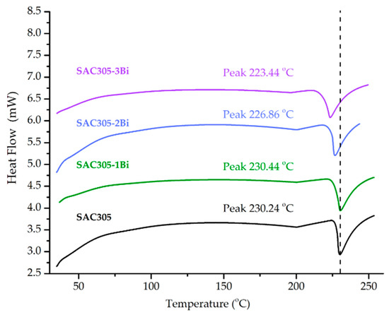 The melting temperature of solder alloys is crucial in the soldering process for enhancing the reliability and suppressing the thermal degradation of solders [21]. Figure 1 shows the differential scanning calorimetry (DSC) curves of un-doped and Bi-doped SAC305 alloy. It was found that each alloy showed a single peak in the DSC observation. The DSC analysis showed that the addition of 1 wt.% of Bi to SAC305 did not show a significant difference in the melting temperature; however, as the Bi concentration in SAC305 increased, the melting temperature decreased. The lowest melting temperature of 223.4 °C was obtained at SAC305-3Bi with a drop of 6.8 °C from SAC305, which has a melting temperature of 230.2 °C.
