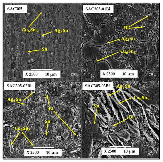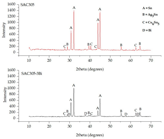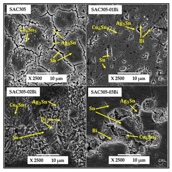 Figure 2 shows the X-ray diffractions (XRD) of the SAC305 and SAC305-Bi to identify the IMC phases of Ag3Sn, Cu6Sn5, and the Bi. The results revealed the presence of Ag, Cu, and Sn IMCs in the form of Ag3Sn, Cu6Sn5, and the Sn matrix, similar to the previous study by Yasmin et al. [3] where the type of IMCs’ phases was identified using XRD; however, the doping element in SAC305 was Lanthanum. Fawzy et al. [22] also reported three types of phases: Sn, Ag3Sn, and Cu6Sn5 in the XRD investigation of SAC355 solder. The presence of Ag3Sn and Cu6Sn5 was due to the phase formation with eutectic Sn regions at the interfaces of the grains [23]. However, it is worth noting that Bismuth (Bi) did not show any IMC phase with other elements. Instead, it was observed as scattered over the solder alloy in the form of solid particulates [17,19].