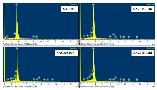 Figure 3 shows the microstructural analysis of the SAC305 and Bi-doped SAC305 alloys and their verification of chemical composition by EDS is given in Figure 4. The results showed the presence of Ag3Sn and Cu6Sn5 IMCs, which were scattered over the Sn matrix [8]. The darker region shows the Sn-matrix and the eutectic area, the grey region indicates the presence of Sn-Cu, and the brighter regions along the grain colonies show the Sn-Ag IMCs. In contrast, the particles in the form of white or medium bright appearance show Bi particles. SEM micrographs also show that the microstructure became refined with the addition of Bi. Bi was found in solid particles in the Sn-matrix without making any IMCs, resulting in refined microstructure, similar to the previous study by Hirai et al., 2019 [19], where the Bi particles were also present as solid-solved in the matrix. Therefore, Bi particles were found at the edges of the Sn-matrix and inter-dendritic regions, which provided a barrier for the dislocation movements and pinned grain boundaries that improved the mechanical properties [24]. According to Muhammad and Ali [25], the decrease in the IMCs’ particle size resulted in the refinement of the microstructure and increased mechanical properties.