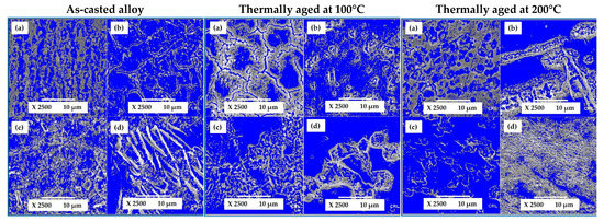The specimens were then placed in a drying oven (Thomas Scientific Model 605 with a maximum temperature of 300 °C, Swedesboro, NJ, USA) at thermally aged temperatures of 100 °C and 200 °C for 60 h. Thermal aging is responsible for reducing strength due to a microstructure change after prolonged exposure to the material at elevated temperatures. The specimens were then etched using a Nital solution (comprising 90% ethanol 10% Nitric acid) for 30 s at room temperature. A scanning electron microscope (JSM5910, JEOL, Tokyo, Japan) was used to capture micrographs at various locations and different magnifications to examine the microstructure. At the same time, the validation of the chemical composition was performed using energy-dispersive X-ray spectroscopy (EDS) through INCA-200 Oxford Instruments, UK. The specimens were also analyzed to determine the IMCs’ phases through XRD analysis (JDX-3532, JEOL, Tokyo, Japan). To further investigate the IMCs’ particle sizes, the scanning electron microscope (SEM) images were digitally processed using ImageJ software (1.52i, NIH, Bethesda, MD, USA). First, the SEM images were uploaded in the ImageJ software and converted to 8- or 16-bit type. Then, a line was drawn equal to the existing scale bar on the original SEM images. Next, the scale on set scale command was adjusted as µm to follow the same unit displayed on the SEM images. After the scale setting, the threshold adjustment of the images was made to allow the software to variate the object of interest. Finally, the “analyze particles” command was used in the analyze menu of the software and that gave the required average particle size in µm.