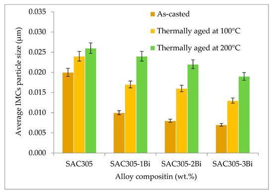 To further analyze the microstructure of the specimens, the SEM micrographs were digitally analyzed using ImageJ software, similar to the previous studies [14,28], as shown in Figure 7. The average IMCs’ particle size with 5% error for the un-doped and Bi-doped SAC305 alloy at different thermally aged temperatures is shown in Figure 8. The results showed that the addition of Bi into SAC305 reduced the IMCs’ particle size, thus causing the grain boundaries to restrain from further growth and resulted in the refined microstructure [16]. On the other side, the thermal aging at 100 °C and 200 °C affected the microstructure by increasing the average IMCs’ particle size. However, the microstructure of Bi-added SAC305 was less affected, as even after thermal aging, the IMCs’ size was found to be less than SAC305.