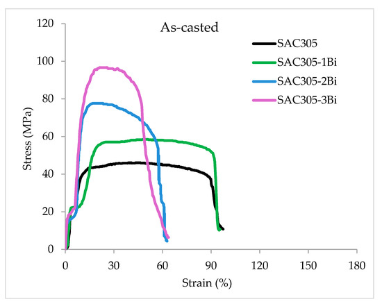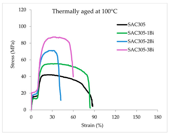 Figure 9, Figure 10 and Figure 11 show the results from the tensile tests for the un-doped and Bi-doped SAC305 alloys as a function of different aging temperatures. The results showed an increase in mechanical properties such as yield strength (YS) and ultimate tensile strength (UTS) after the Bi addition to SAC305. The highest improvement in the mechanical properties was investigated at 3 wt.% of Bi composition. The doping of 1 wt.% of Bi into SAC305 increased the YS up to 55 MPa, which was 39.1 MPa for SAC305. The value of YS further increased to 72.5 and 83.4 MPa for 2 wt.% and 3 wt.% of Bi addition, respectively. Similarly, the UTS for SAC305 was 46 MPa, which was increased up to 58.5, 77.6, and 96.7 MPa for SAC305-1Bi, SAC305-2Bi, and SAC305-3Bi, respectively. A likely explanation for the improvement in the SAC305 after the Bi doping could be the refinement of the microstructure due to the reduction in IMCs’ particle size. The addition of 3 wt.% induced a higher dispersion of Bi particles over the eutectic region with the Sn matrix, which contributed to the enhancement of YS and UTS, as evident from the SEM images.