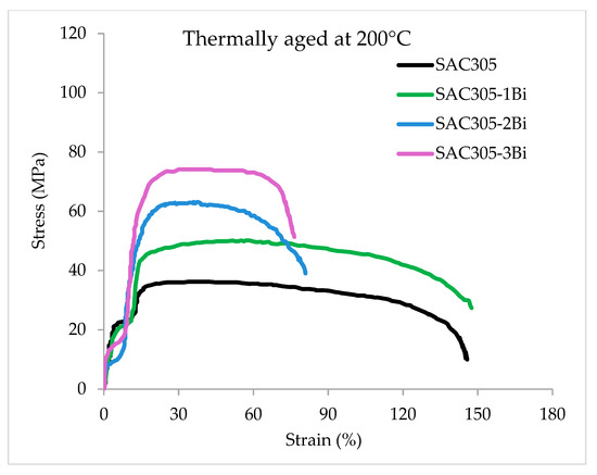 Figure 9, Figure 10 and Figure 11 also show that, as the aging temperature increases from 100 °C and 200 °C, a reduction in both YS and UTS was observed, which means that the microstructure of the thermally aged specimens at the high temperature was highly affected due to the IMCs’ growth and subsequently reduced the solder joint reliability. Although the decrease in the mechanical properties was encountered while subjected to thermal aging, it is interesting to note that even after thermal aging at high temperatures, the mechanical properties of Bi-doped specimens were higher than the un-doped and aged SAC305.