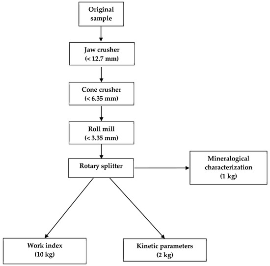 For this work, samples from three metalliferous ores from Argentine Patagonia were selected and prepared according to the conventional preparation scheme used to prepare the feed in a Bond’s ball mill standard test (Figure 1). In each case, the sample amount prepared was enough to carry out the SIM tests to obtain the kinetic parameters k [14] and also to obtain the BSM work index [1], which will be used for validation purposes.