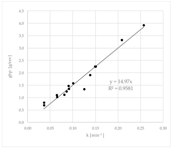 After plotting gbp (determined with the standard procedure) versus the kinetic parameter k (calculated by the SIM methodology), as is shown in Figure 2, a linear estimation can be obtained (Equation (5)) with a correlation coefficient of 95.8%.