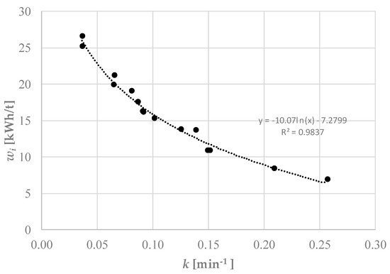 As a consequence of the relationships evidenced in Equations (5) and (6), it can be inferred that there should be a correlation between the Bond work index and the kinetic constant k at each monosize. Figure 4 depicts this relationship between wi and k from the actual data gathered in Table 2, wherein a logarithmic correlation (Equation (7)) poses a correlation coefficient of 98.37%.