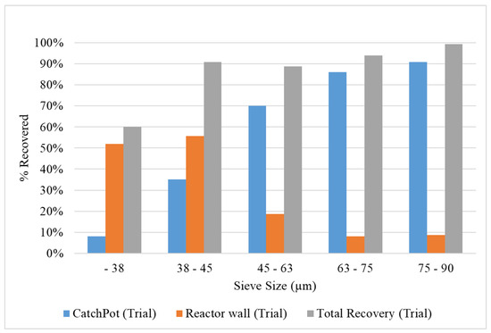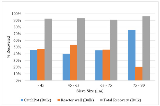 When plasma treating the bulk sample, the −38 µm and 38–45 µm powders were added together due to the small amount of 38–45µm fraction available. The distribution graph in Figure 3 shows that powders obtained from the catch-pot and from the reactor walls gave recoveries less than 50% for fractions below 75 µm. A sharp rise is observed for the 75–90 µm range that shows a 75% recovery from the catch-pot with only 20% recovery from the reactor wall. This is consistent with the results obtained from the controlled trial experiment that showed the highest recoveries to the catch-pot when processing 75–90 µm size fractions.