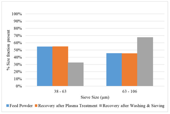The recoveries after powder cleaning and sieving differed significantly from the feed powder. A decrease for both the 0–38 µm and the 45–63 µm fractions was observed, while an increase for the 63–75 µm and the 75–90 µm fractions was obtained. When comparing the 0–63 µm and the 63–106 µm, it was clear that larger particles were produced during the spheroidisation of powder. The properties of the products depend on the heating times and flow paths of the particles through the plasma taking into account the size, melting point and heat capacity of the particle. The possible cause of the particle increase might be due to the incorporation of evaporated fine particle into large densified particles during the spheroidisation process. The decrease especially in the 45–63 µm fraction indicates that this might have been the reason for the increased 63–106 µm fractions. The change in the size distribution of the powders is clearly illustrated in Figure 4. It is evident that the plasma treatment of the powder resulted in particle growth with a significant increase in the particle sizes larger than 63 µm and a decrease of fine particles (<63 µm) by 22%.