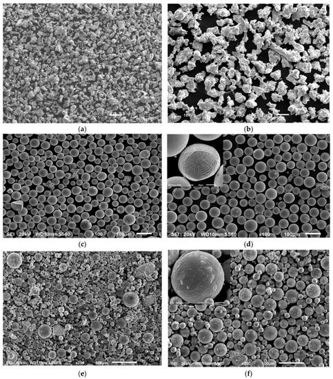 Low and high magnification micrographs of the AISI 304 SS powder for (a,b) irregular feed powder, and products after the plasma spheroidisation from the (c,d) catch-pot and (e,f) reactor walls for the −63 µm and +63–106 µm size distributions.