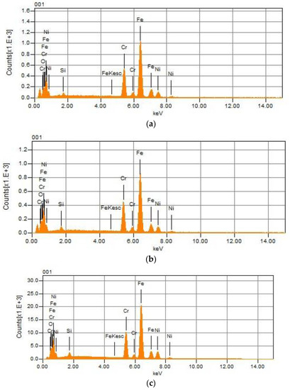 The EDS spectra in Figure 7a–c show a consistent representation of the elements for the austenitic type 304 stainless steel showing the presence of carbon, chromium, nickel, silicon and iron, which is the primary metal. The measured composition from eds are shown in Table 4. However, manganese was not picked up, which would be about a 2% weight fraction of the steel. In stainless steel, manganese is added as a γ-stabilizer similar to the nickel alloy. The as-received powder in its irregular form, together with the product spherical powder from the catch-pot and reactor walls, shows the presence of oxygen. The oxidation resistance of 304 stainless steel is due to the high Cr content that is greater than 18 wt.%, which forms a tight adherent chromia (Cr2O3) surface film [13]. The Si also plays a significant role on oxidation resistance because of the formation of the SiO2 between the base metal and external chromia scale [14]. It is possible that the silicon oxide concentration increased on the Rwall powders due to the heating effect of the plasma treatment of finer particles with larger surface area for the reactions to occur. Particle oxidation occurs while solidifying is ongoing in-flight within the reactor. It is evident that when the Si composition is increased, the Cr composition is low for products on the Rwall, while the inverse is true for the catch-pot product.