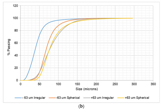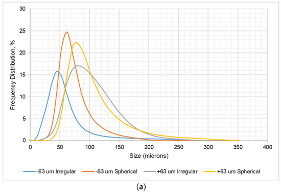 The cumulative curve in Figure 9 demonstrates the three diameters corresponding to 10% (D10), 50% (D50) and 90% (D90) of the cumulative distribution, where D50 represents the median values. These values are summarized in Table 5. The irregular powder has a median value of 40 µm and 77 µm for the finer and coarser fractions, respectively, while the spherical powder has 56 µm and 76 µm for the finer and coarser fractions. It is clear from the graph that the coarse powders have a closely similar particle size range, and the fine powder has a slightly varying size range. The shift in the particle size is evidence of the absence of the fine powders that were stuck on the reactor wall.