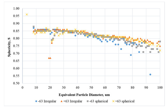Given the PSD range, the sphericity characterises the particle shapes quantitatively, as depicted in Figure 8 and averaged in Table 5. This sphericity index may vary between 0 and 1, and the smaller the value, the more irregular the shape of the particle [15]. The powder particles in the size range above 63 µm were more angular and had a sphericity below 0.8, while finer fractions had a sphericity above 0.8. This would be expected to affect the flow characteristic of the powder particles.