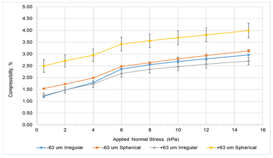 The compressibility results shown in Figure 10 present a measure of change in volume in response to a change in applied normal stress from 1 to 15 kPa. The spherical powders show a higher compressibility than irregular powder, typical of low cohesive powders with less interlocking capabilities [17]. The high compressibility can lead to minimal pores formed after additive manufacturing owing to the high packing and density achieved and the ease of scraping specifically in the powder bed AM process. The fine powder had a higher compressibility than the coarse powder.