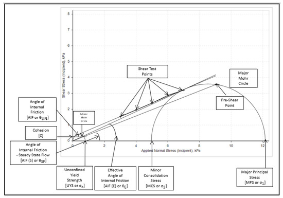 Typical results of the shear test are plotted on a Mohr’s circle as shown in Figure 11. The following parameters can be obtained from the shear test: angle of internal friction AIF°, angle of internal friction at steady-state flow AIF(S)°, effective angle of internal friction AIF(E)°, cohesion (C), minor consolidation stress (MCS), unconfined yield strength (UYS) and the major principal stress (MPS). Furthermore, the flowability indexes ffc/Relj and Relp can be derived from MCS, UYS and MPS [9,10].