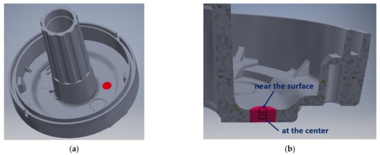 Place of sampling (red) of the casting for microstructure analysis: (a) Site within the casting; (b) Specimen regions evaluated.