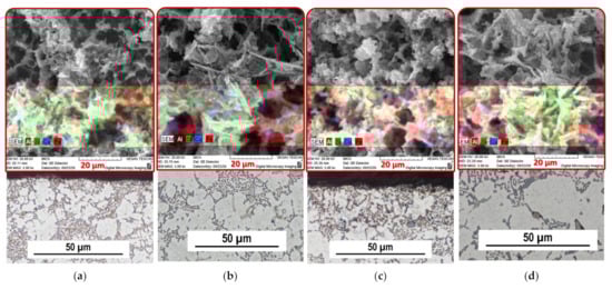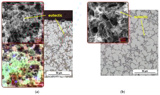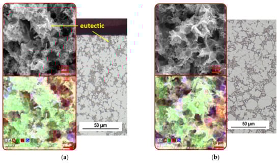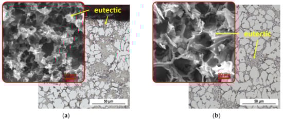 The SEM images (red box) further identify the difference in eutectic silicon morphology based on the region. Eutectic Si crystallized in the central region in a coarse plate-like morphology typical of unmodified Al-Si alloys (Figure 4a), while eutectic silicon grains crystallized in the surface region as fine, sharp-edged and fibrous particles (Figure 4b). The change in Si morphology is due to the higher cooling rates [,]. It has been observed that a rapid solidification process changes the shape of the eutectic Si so that it is similar to the chemically modified eutectic Si []. Intermetallic phases rich in Cu and Fe are also observed in the interdendritic region and along the α-phase grain boundaries.