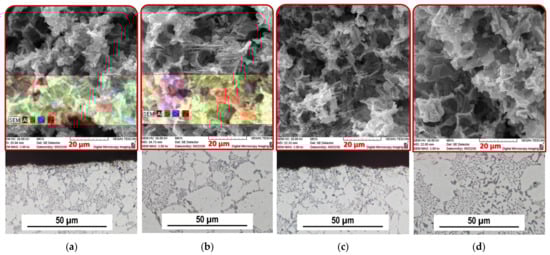 Images of the structure of the castings from the Z10 and Z55 alloys after heat treatment; OM, SEM: (a) Z10 surface; (b) Z10 central region; (c) Z55 surface; (d) Z55 central region.