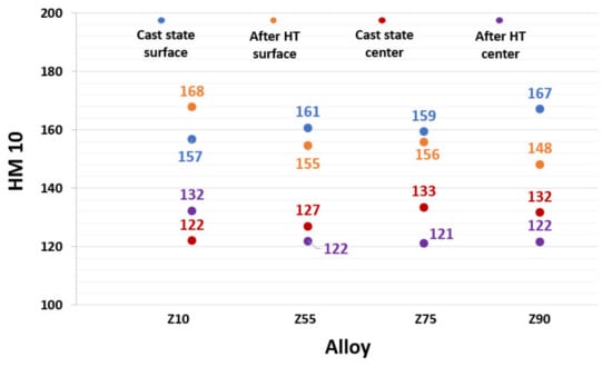 The course of the resulting values of microhardness had an increasing trend in the cast state with an increasing content of returnable material in the batch. On the other hand, it should be added that the increase in values (in the region near the surface and in the central region as well) was in a narrow interval. After the application of heat treatment an increase in both values was observed in the Z10 alloy (by 10 HM), but in the Z55, Z75 and Z90 alloys a decrease occurred in comparison with the cast state.