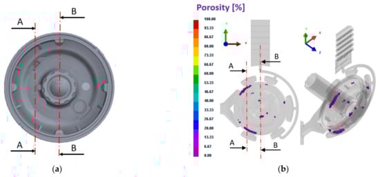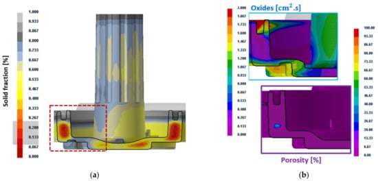 A-A cut through the casting shown in numerical simulation: (a) Display of hot spots; (b) Display of prediction of the presence of oxides and pores.