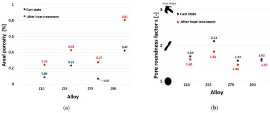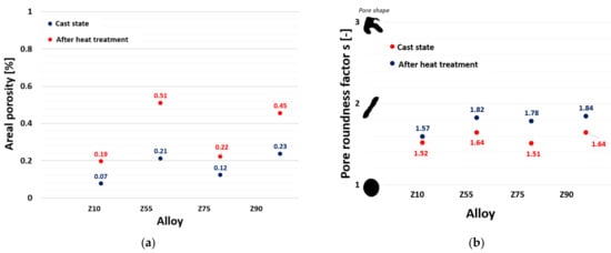 Evaluation of the areal porosity on the two selected cuts (incisions) showed that castings from the Z55 and Z90 alloys manifested the highest areal porosity. In general, the values of areal porosity (in the state without heat treatment) reached low and acceptable values. The highest measured value in the A-A cut was 0.40% of the areal porosity in the Z90 alloy casting, and in the B–B cut the highest value was only 0.21% for the Z55 alloy and 0.23% for the Z90 alloy. The results of the roundness factor evaluation on the cuts had a constant course, and in both cases the resulting values fluctuated in narrow intervals. A narrow interval ranging from 1.42 to 2.11 (both cuts/incisions and including heat treatment) indicates that the oval shape of the pores prevailed without significant sharp ends. Based on this result, it can be concluded that the formation of porosity in castings was caused primarily by the mechanism of bubble (air/gas pocket) formation, which is characterized by a spherical shape, and possibly by a combination of mechanisms of bubble and micro-shrinkage formation (typical contour-shaped cavities copying the dendritic structure). Pores primarily formed in interdendritic spaces–places where hot spots occur []. Excessive porosity in the casting subsequently causes worsened strength and fatigue properties, a deterioration in the tightness of the castings or a reduction in the quality of the machined surfaces.