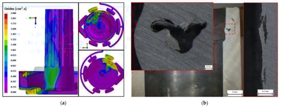 Porosity occurring near the casting walls: (a) Numerical simulation showing surface regions with increased presence of oxides; (b) Pores disrupting the geometry of the casting from Z55, after heat treatment.