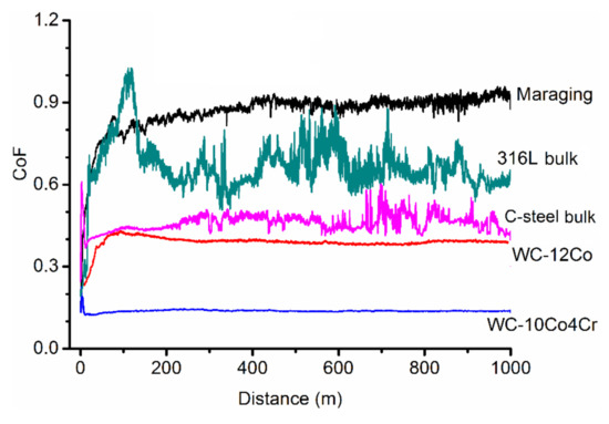 - Pulsford, J.; Venturi, F.; Kamnis, S.; Hussain, T. Sliding wear behaviour of WC-Co reinforced NiCrFeSiB HVOAF thermal spray coatings against WC-Co and Al2O3 counterbodies. Surf. Coat. Technol. 2020, 386, 1–11. [Google Scholar] [CrossRef]