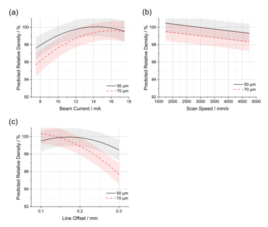 Figure 2a,b clearly show the increase in predicted relative densities with increasing beam current. The curve in Figure 2a suggests that although higher densities can be achieved when the scan speed is reduced at a given value for the beam current, the effect is rather small. In comparison to that, the difference between the single curves as shown in Figure 2b for three different line offsets is more pronounced. Line offset also seems to affect the slope of the curve in Figure 2c, which presents the dependency of the predicted relative density on the scan speed. When a line offset of 0.25 mm is used, the relative density is expected to decrease with increasing scan speed, whereas with a line offset of 0.15 mm, the scan speed seems to have little influence on part density.