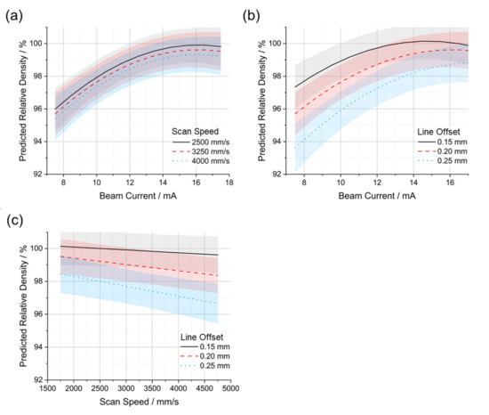 Interaction plots for the effect of (a) beam current at varied scan speeds, (b) beam current at varied line offsets and (c) scan speed at varied line offsets with respect to predicted relative densities. The shaded areas mark the 95% prediction intervals.