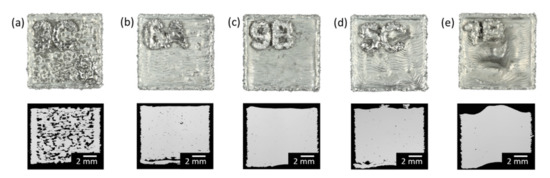Apart from the relative density, samples were also evaluated by visual inspection of their top surfaces. In Figure 3, the surfaces of five representative specimens as well as the corresponding metallographic cross-sections are shown.