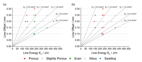 Consequently, a parameter set with a suitable energy input had to be determined in order to obtain components with a high relative density on the one hand and to avoid swelling on the other hand. For this purpose, all samples were mapped according to the classification of their top surfaces in the diagram shown in Figure 4, in which the line offset is plotted against the line energy for the two investigated layer thicknesses, respectively. The line energy EL is defined according to the following equation (Equation (3)):