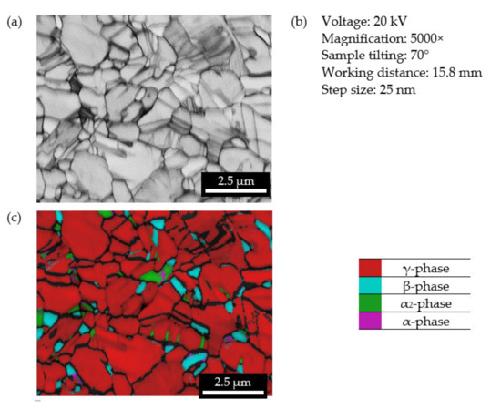 The scanning parameters are shown in Figure 6b. The EBSD band contrast map shows the deformation-free microstructure. The pattern from the grain and especially on the phase boundaries have no solution, and are shown in dark gray in the band contrast band and black in the phase map. This allows us to clearly distinguish between the phase and the grain boundaries. The grain size is less than 4 µm with standard size distribution. Due to high acceleration voltage and resulting beam spot of about 30 nm, the α2 lamellae, which can be seen clearly in the SEM image in Figure 5, can only be resolved sporadically in the EBSD maps. Figure 6c shows the amount and distribution of the different phases. The γ-phase occupies the largest area, whereby the α2 lamellae in the α2/γ-colonies can only be observed sporadically. The β-phase is localized at the grain boundaries, as already observed in the SEM images. Given the similarity with the crystallographic parameter of α2-phase and α-phase, it was not possible to distinguish clearly between those two phases from the same crystallographic space group. Since the presence of the α-phase is improbable, its indication can be considered as incorrect.