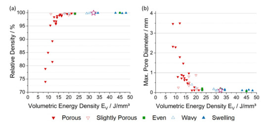 In Figure 7, the relative densities and the maximum pore diameters obtained from the metallographic cross-sections are plotted against the volumetric energy density EV.