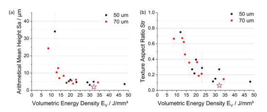 (a) Arithmetical mean height Sa and (b) texture aspect ratio Str measured by means of confocal laser scanning microscopy for different EB-PBF volumetric energy densities. The optimized parameter set is marked with a star symbol.