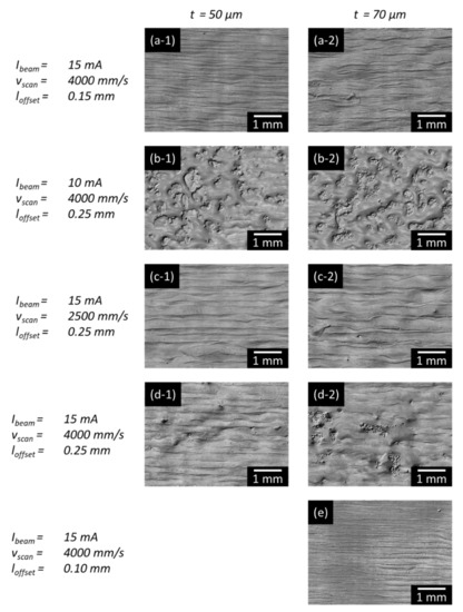 where U is the acceleration voltage of 60 kV, while Ibeam and vscan represent beam current and scan speed [7]. Additionally, iso-lines of identical areal energy input EA are included in the diagrams. The areal energy input EA can be described by Equation (4):