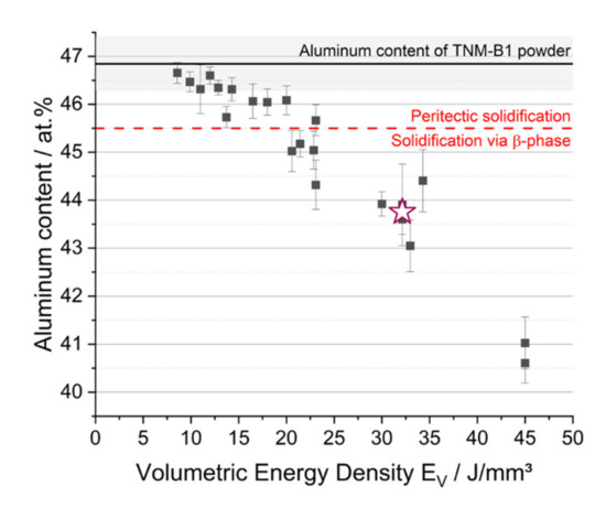 The aluminum content was determined by means of EDX measurements to allow a qualitative comparison among the specimens. The results are plotted in Figure 10 against the volumetric energy density. The aluminum content of the original TNM-B1 powder raw material was determined via EDX measurements on metallographic particle cross-sections and is shown as a benchmark in Figure 10.