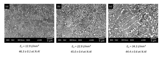 SEM images of microstructures on metallographic cross-sections. Volumetric energy density for manufacturing increases and aluminum content decreases from (a–c).