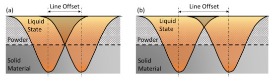 Schematic illustration of overlapping of two adjacent melt tracks at (a) optimal line offset and (b) too large line offset (adapted from [28]).